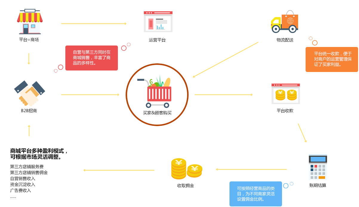 微商城结合“信息—资金—实物”的三位一体思路,从平台到入驻商家,再到终端顾客,形成一个完整的电商生态模式。